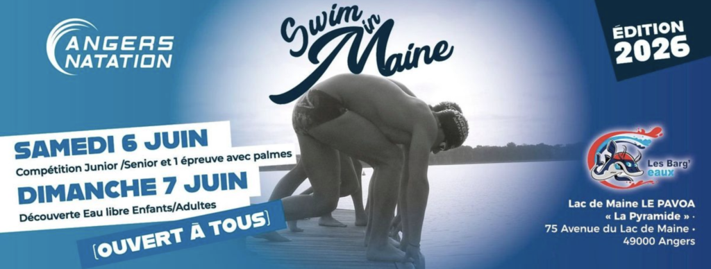 Le 6 et 7 JUIN 2026 rendez-vous au Lac de Maine, coté plage pour la cinquième édition du Swim in Maine, nage en eau libre sur différentes distances et pour tout âge.